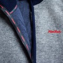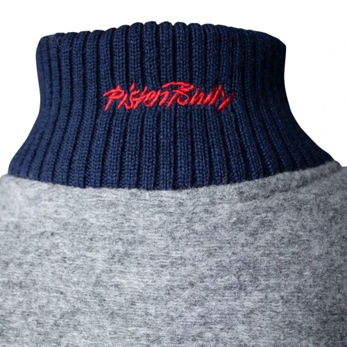 Den myke og behagelige grå filten er kombinert med ermer som er strikket i en mørk blå kontrastfarge.